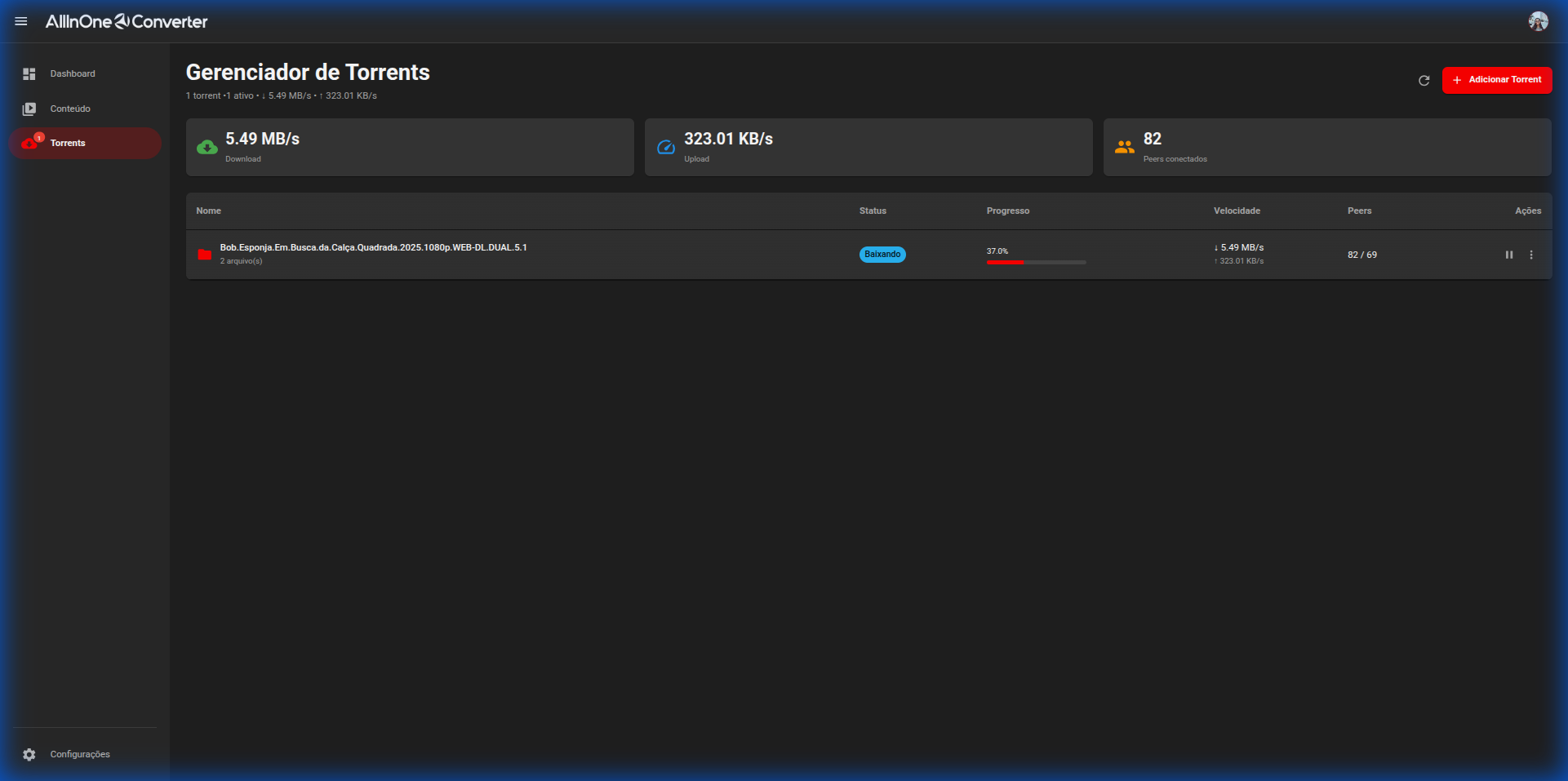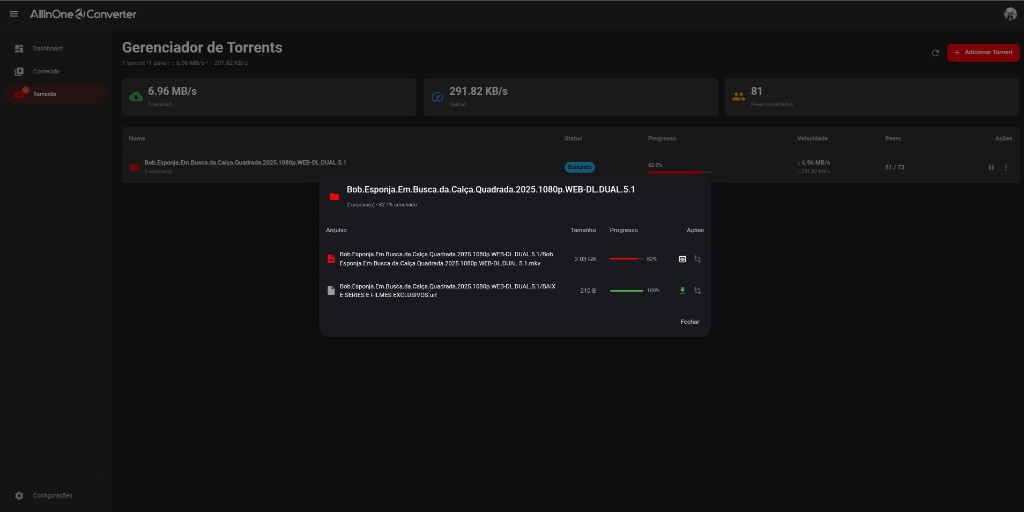 Suporte a magnet links e arquivos .torrent com seleção de arquivos e estatísticas em tempo real.